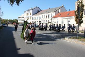 Natürlich durfte dabei auch der Musikverein Leopoldau nicht fehlen, der nach einigen Worten des Pfarrers vor der Kirche den traditionellen Umzug der Erntekrone durch den gesamten Leopoldauer Platz mit Marschmusik umrahmte.