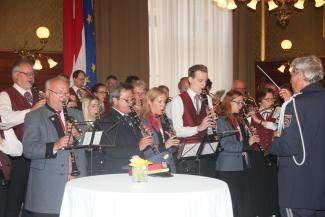 Mag. Wolfgang Findl, Landesobmann des Wiener Blasmusikverbandes gratulierte dem frischgebackenen Bürgermeister zum Amtsantritt und freut sich auf die zukünftige Zusammenarbeit. Anschließend hielten beide Bürgermeister unter Blitzlichtgewitter noch jeweils eine kurze Ansprache, in der sie sich bei allen Musikern für ihren Einsatz bedankten.
